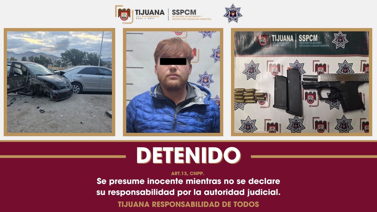Mediante comandos verbales, los oficiales lograron controlar la situación y asegurar al sujeto, identificado como José Luis “N”, de 22 años, a quien durante la intervención se le decomisó un arma tipo pistola calibre 9 milímetros, abastecida con dos cartuchos útiles, así como el aseguramiento del vehículo involucrado en el incidente.