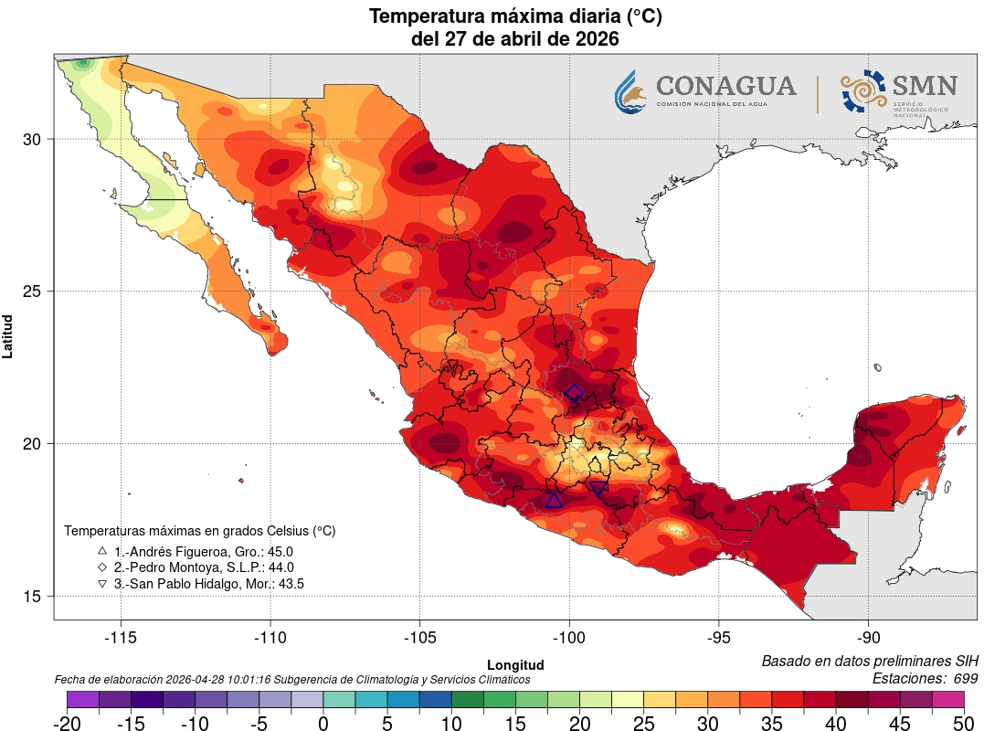 De acuerdo con la Comisión Nacional del Agua (Conagua), en los últimos días se ha registrado una tendencia de calor fuerte en gran parte del país, principalmente en el norte, centro y sur, donde incluso se han alcanzado hasta 45 grados en algunas regiones.