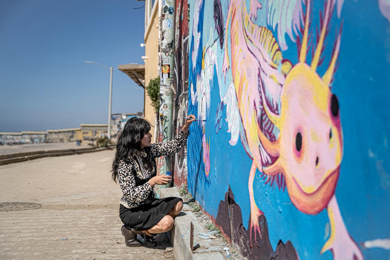 Con el objetivo de embellecer los espacios públicos y promover el cuidado del medio ambiente, la muralista Anabelle Saldaña, egresada de la licenciatura en Artes Plásticas de la UABC, realiza una serie de murales en el andador turístico de Playas de Tijuana en colaboración con comerciantes de la zona y la delegación.