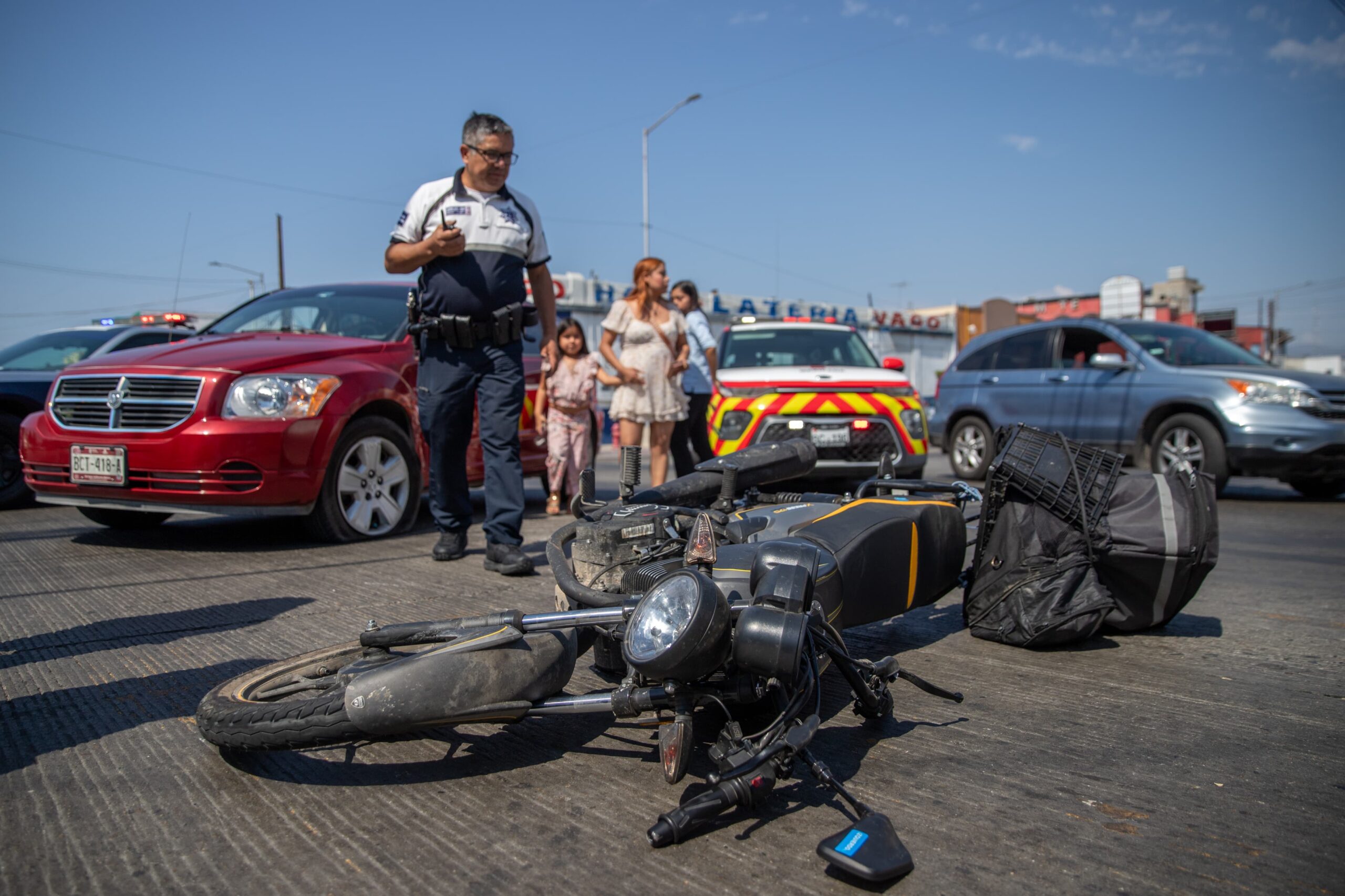 Por la fuerza del impacto, el conductor de la motocicleta quedó tendido sobre la vialidad sin poder moverse por sí mismo. Paramédicos de la Cruz Roja lo trasladaron a un hospital para recibir atención médica.