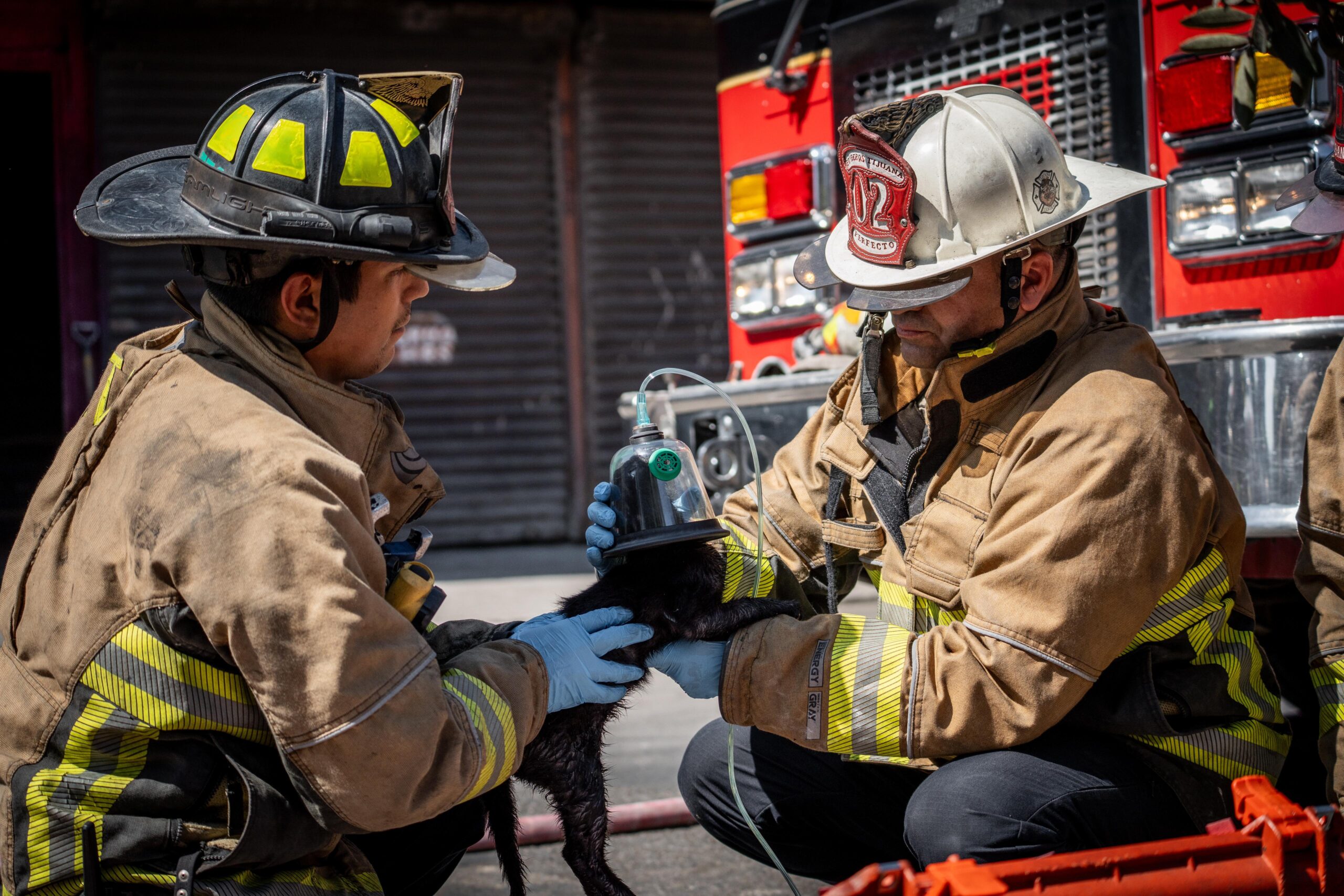 El subdirector operativo de Bomberos Tijuana, Pedro Perfecto Lugo, brindó asistencia ventilatoria a un pequeño gatito negro que presentaba paro respiratorio, logrando estabilizarlo y entregarlo con vida a sus dueños.