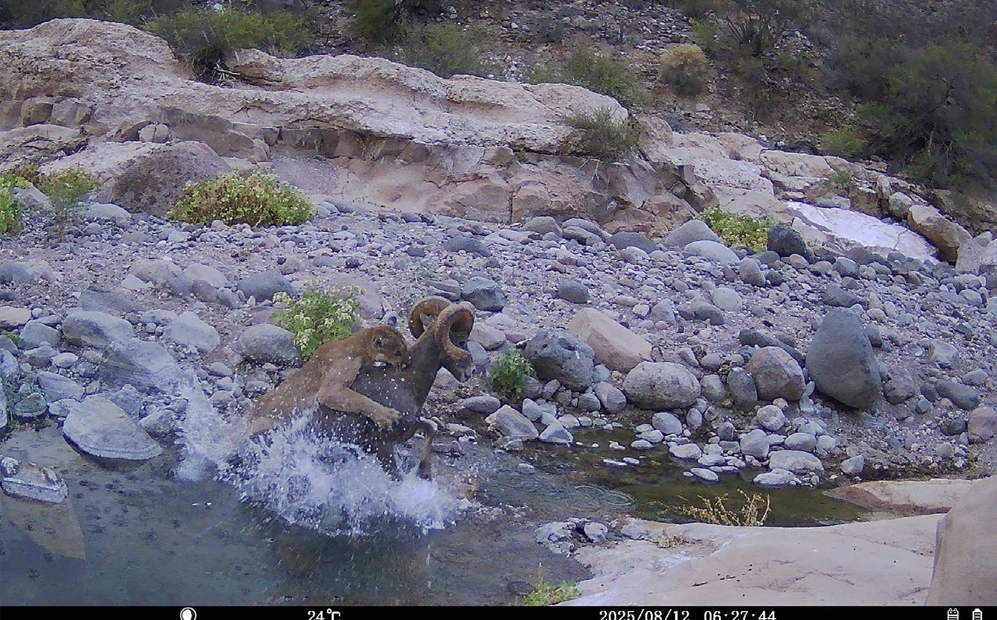 Una cámara de monitoreo instalada en el Área de Protección de Flora y Fauna (APFF) Valle de los Cirios captó una escena extraordinaria: el momento en que un puma caza a un borrego cimarrón en medio de un arroyo.