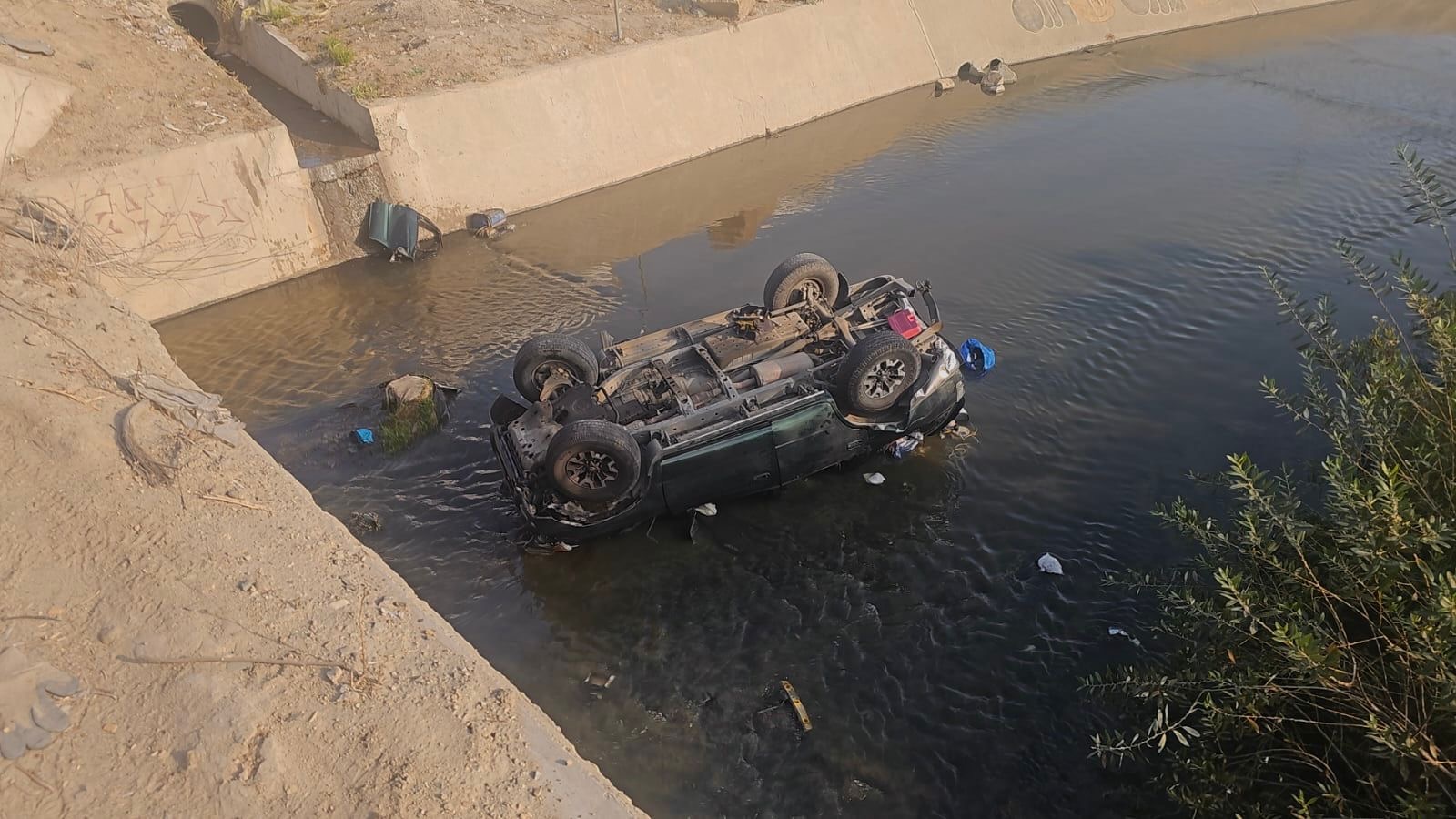La mañana de este domingo se registró un fuerte accidente en el bulevar Insurgentes, a la altura del bulevar Olivos Sur, cuando una camioneta Toyota fue impactada por un Mazda, lo que provocó que la camioneta se proyectara aproximadamente 15 metros hacia el canal del Arroyo El Carrizo y terminara volcada.