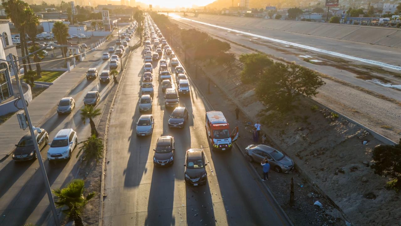 El percance ocurrió a la altura de los juzgados familiares, donde un Nissan Sentra negro y un Toyota Corolla gris, ambos con placas de Baja California, colisionaron. Tras el impacto, el Toyota salió del camino mientras que el Nissan quedó detenido en el carril central, obstruyendo la circulación.