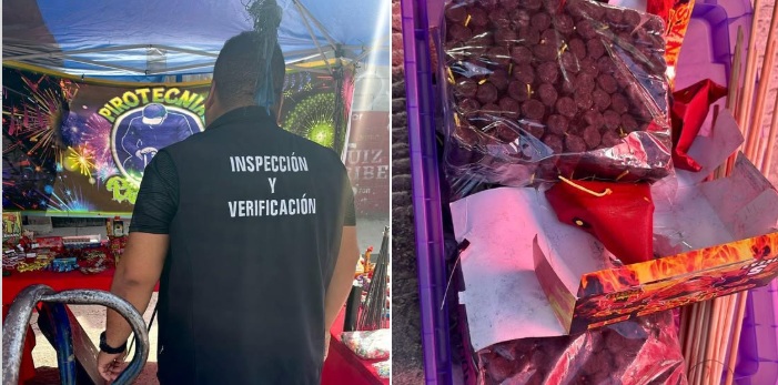 La Dirección de Inspección y Verificación decomisó 30 kilos de pirotecnia y explosivos en un puesto de un mercado sobre ruedas de la colonia Cañadas del Florido en la Delegación La Presa Este.