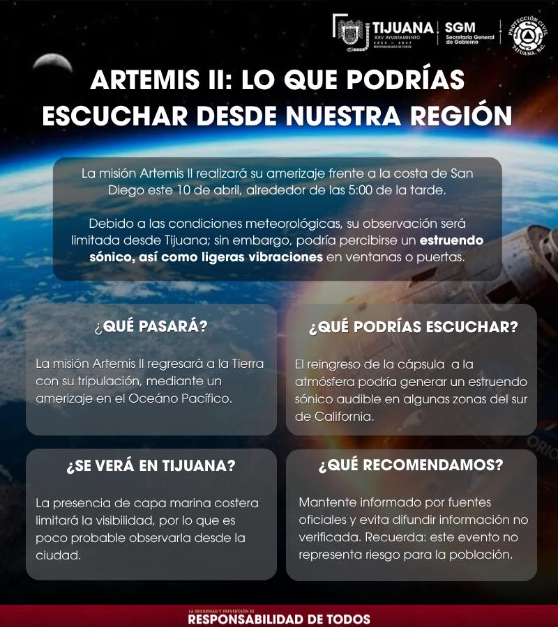 Protección Civil de Tijuana alerta a la población sobre un posible “temblor” en el cielo de la ciudad durante la tarde de este viernes, que se deberá a la llegada los astronautas como parte de la misión Artemis II.