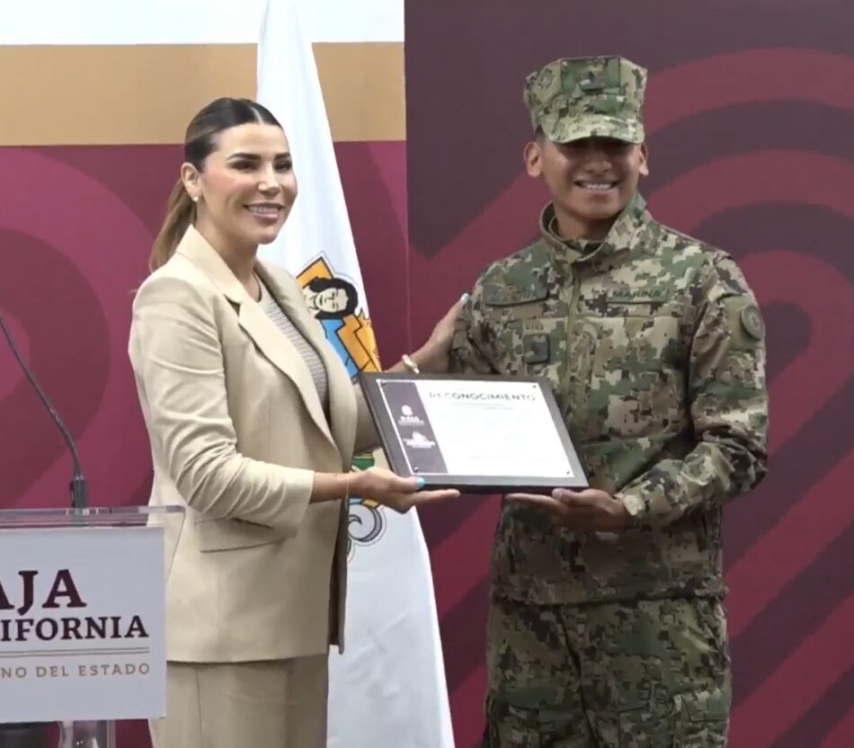 La gobernadora de Baja California, Marina del Pilar Ávila Olmeda, otorgó un reconocimiento al elemento de la Secretaría de Marina, Kevin Francisco Pérez Organista, por su intervención para salvar a personas en riesgo de ahogamiento en playas de San Felipe, durante el operativo de Semana Santa.
