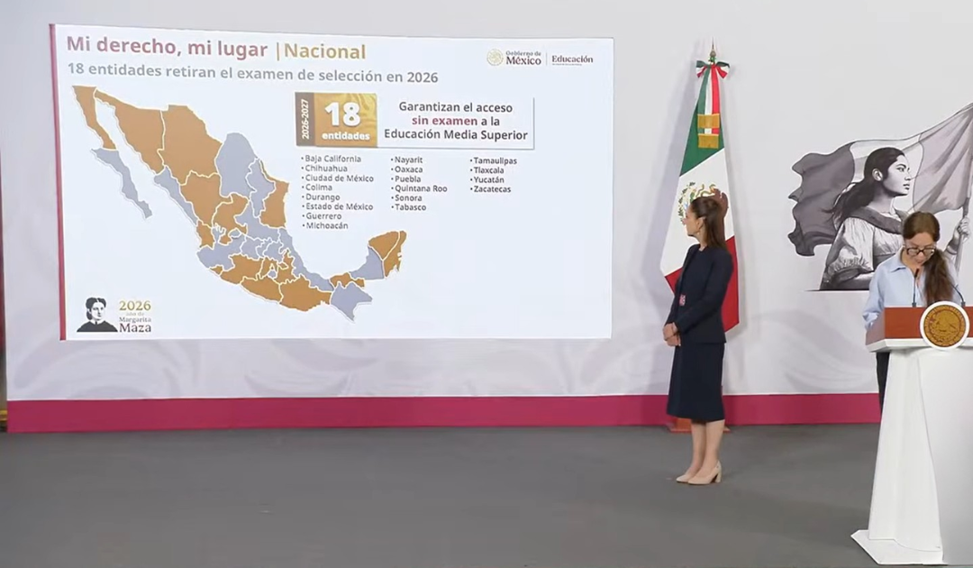 Acompañada por la subsecretaria de Educación Media Superior, Tania Rodríguez Mora, la mandataria dio a conocer el programa “Mi derecho, mi lugar”, el cual busca garantizar el acceso directo de estudiantes de secundaria a la preparatoria.