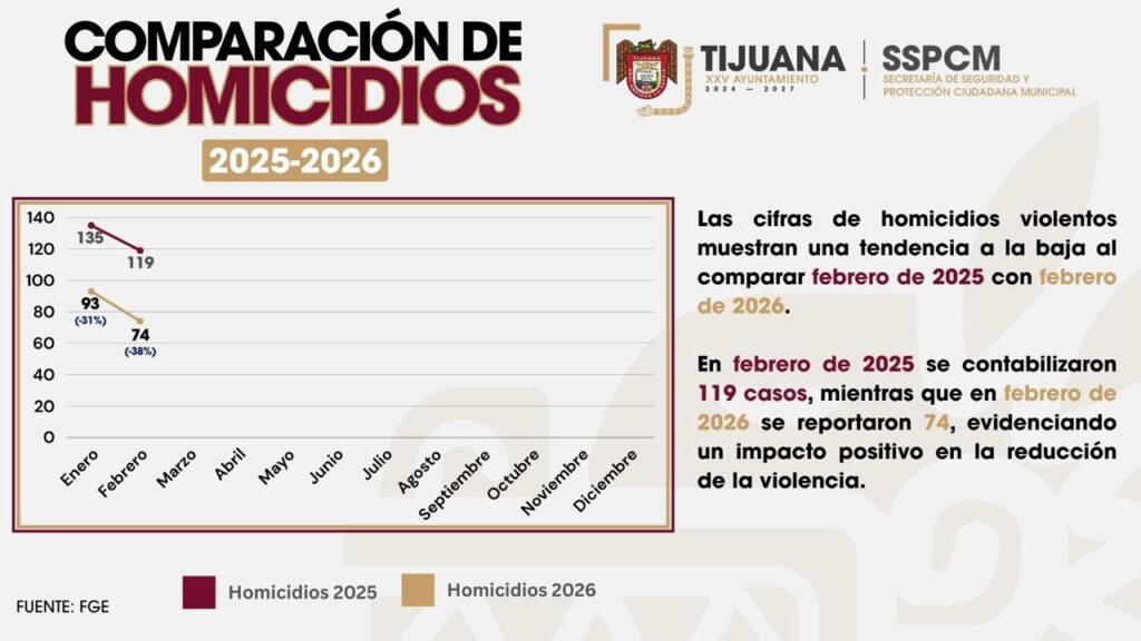 La Secretaría de Seguridad y Protección Ciudadana Municipal (SSPCM) informó que en febrero de 2026 se registró una disminución del 38 por ciento en el número de homicidios, en comparación con el mismo mes de 2025.