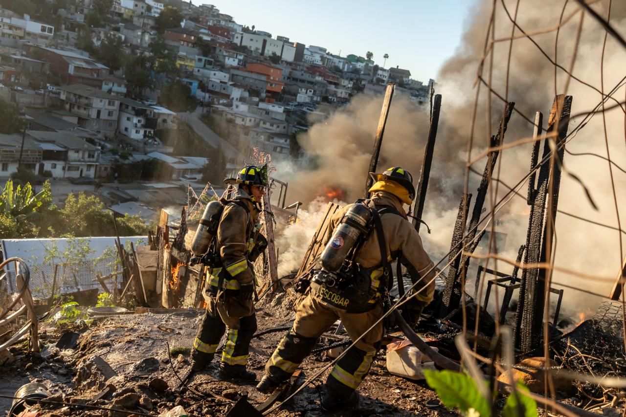 Un fuerte incendio registrado en una zona de invasión ubicada en una ladera de la colonia Libertad, sobre las calles Apolo y 16, consumió por completo dos viviendas de madera.