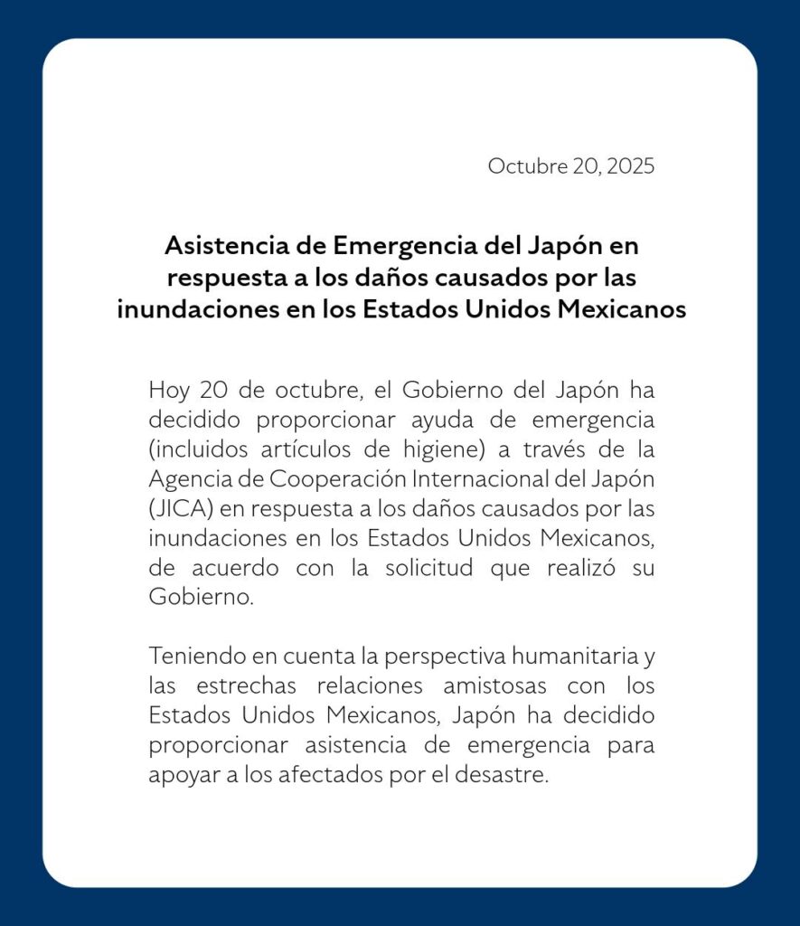 De acuerdo con un comunicado oficial, la ayuda —que incluye artículos de higiene y otros insumos básicos— será enviada a través de la Agencia de Cooperación Internacional del Japón (JICA), en respuesta a la solicitud realizada por el Gobierno de México.