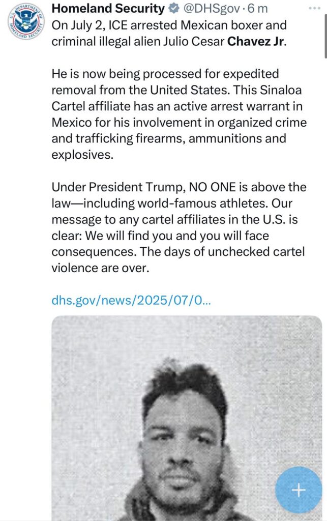 Funcionarios del Departamento de Seguridad Nacional (DHS, por sus siglas en inglés) dijeron a TMZ Sports que Julio César Chávez Jr., de 39 años e hijo de la leyenda del boxeo Julio César Chávez Sr., fue detenido y actualmente está siendo procesado tras haber sido puesto bajo custodia en el área de Los Ángeles.