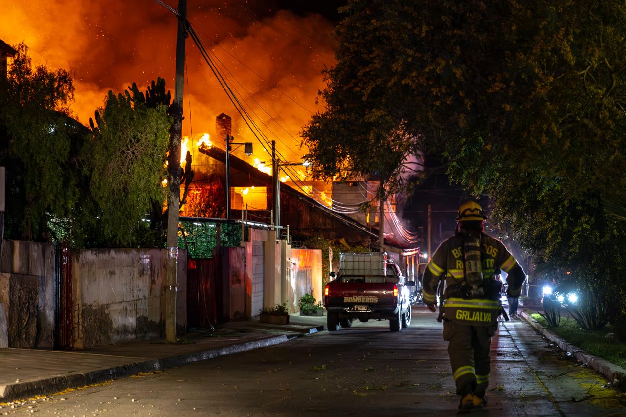 Alrededor de 20 elementos del Cuerpo de Bomberos de Playas de Rosarito trabajaron durante más de dos horas para controlar y sofocar el fuego, que finalmente consumió el inmueble en su totalidad.