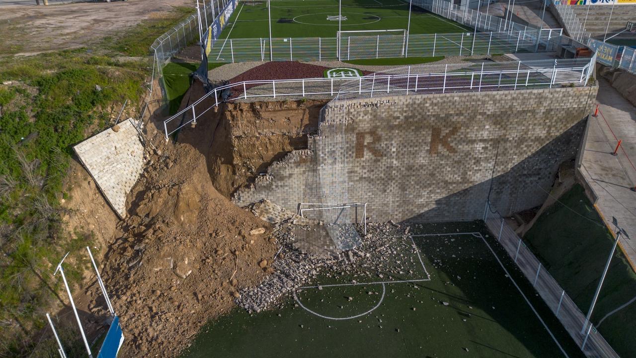 Imágenes aéreas evidencian la magnitud del deslave, donde una porción del talud cedió y arrastró parte del muro divisorio, así como barandales y malla ciclónica. El material desprendido quedó esparcido sobre la superficie sintética del campo deportivo, donde se observan bloques y escombros que cubren parte del área.