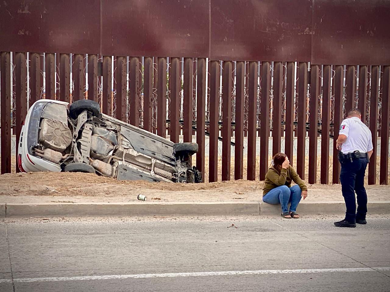 El vehículo, un Volkswagen blanco conducido por una mujer, circulaba presuntamente en dirección a la colonia Libertad cuando la conductora perdió el control, salió del bulevar y terminó volcado frente al muro fronterizo.