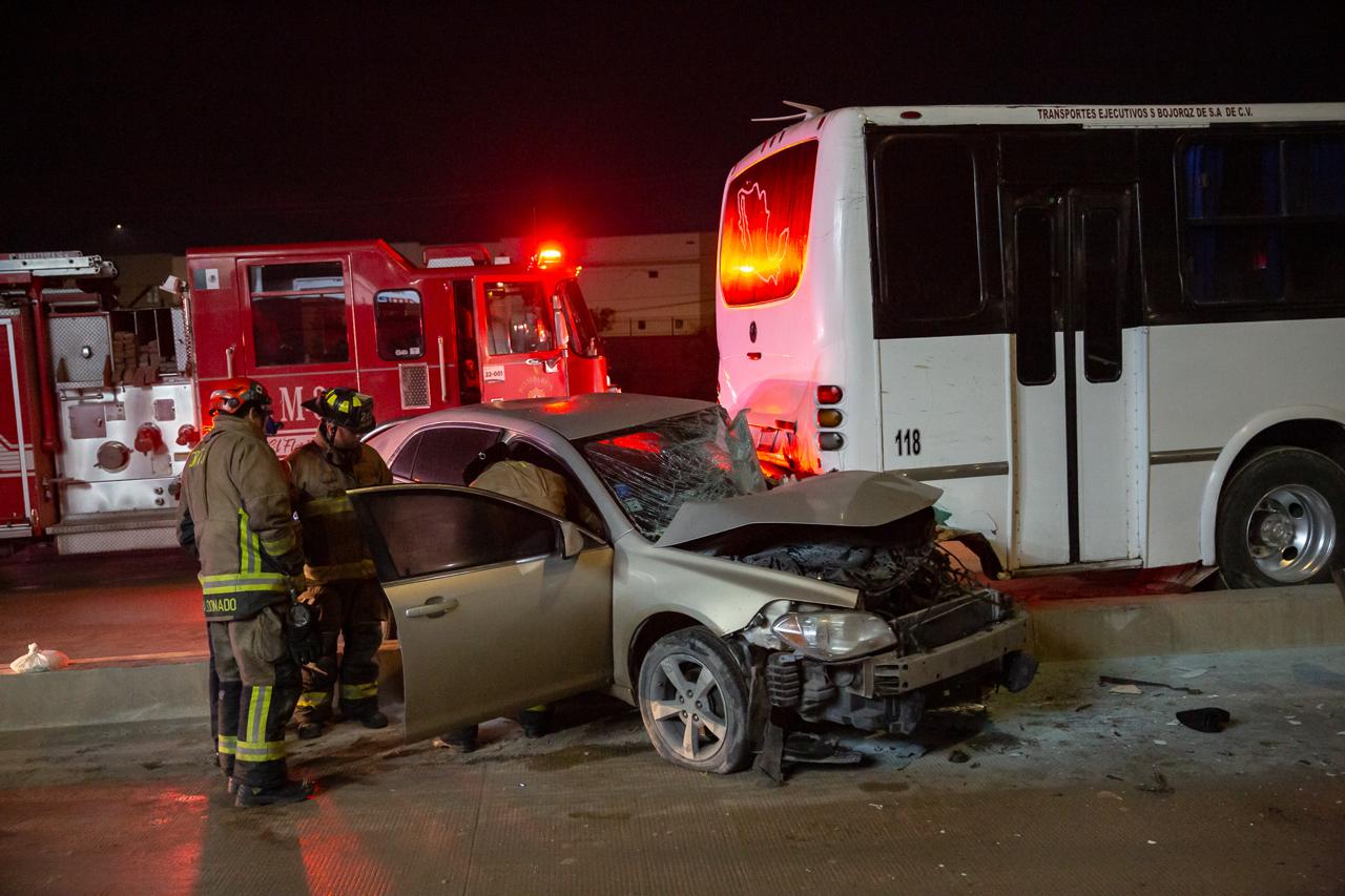 Un aparatoso accidente se registró sobre el Corredor 2000, a la altura de Valle Bonito, donde un sedán Chevrolet Malibú color café chocó por alcance contra la parte trasera de un camión de transporte de personal de la empresa TEBSA, unidad 118.