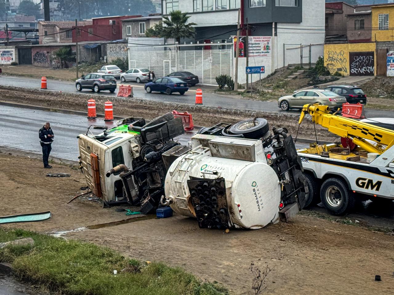 Se trató de la volcadura de una pipa perteneciente a la empresa Masmas Vegetal, la cual terminó a un costado de la vialidad. A pesar de lo aparatoso del accidente, el percance dejó únicamente daños materiales y no se reportaron otros vehículos involucrados.