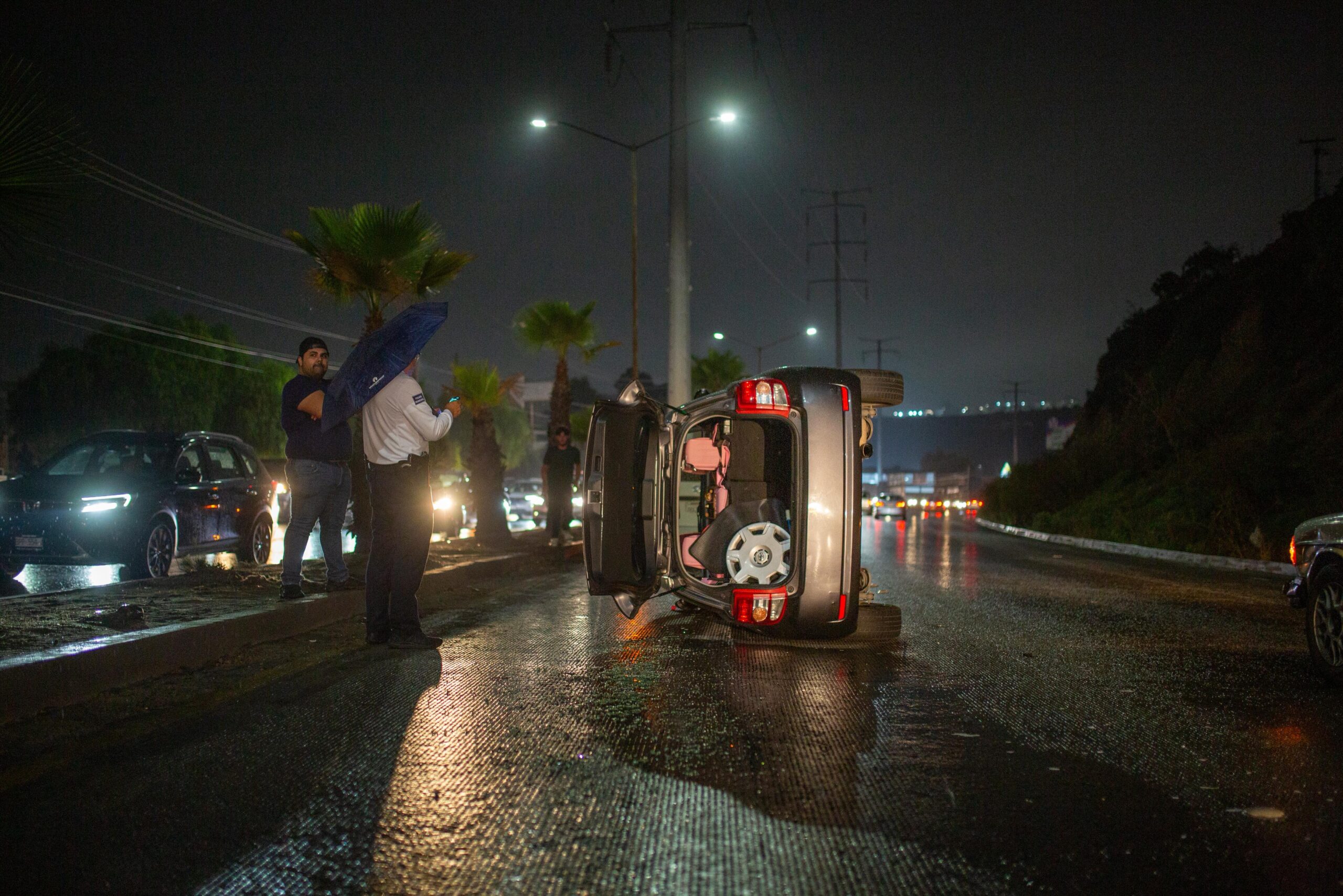 De acuerdo con información extraoficial, la conductora del Scion declaró que intentó esquivar a un perro que cruzaba la calle. Al maniobrar, perdió el control del volante debido al pavimento mojado, lo que provocó la volcadura.