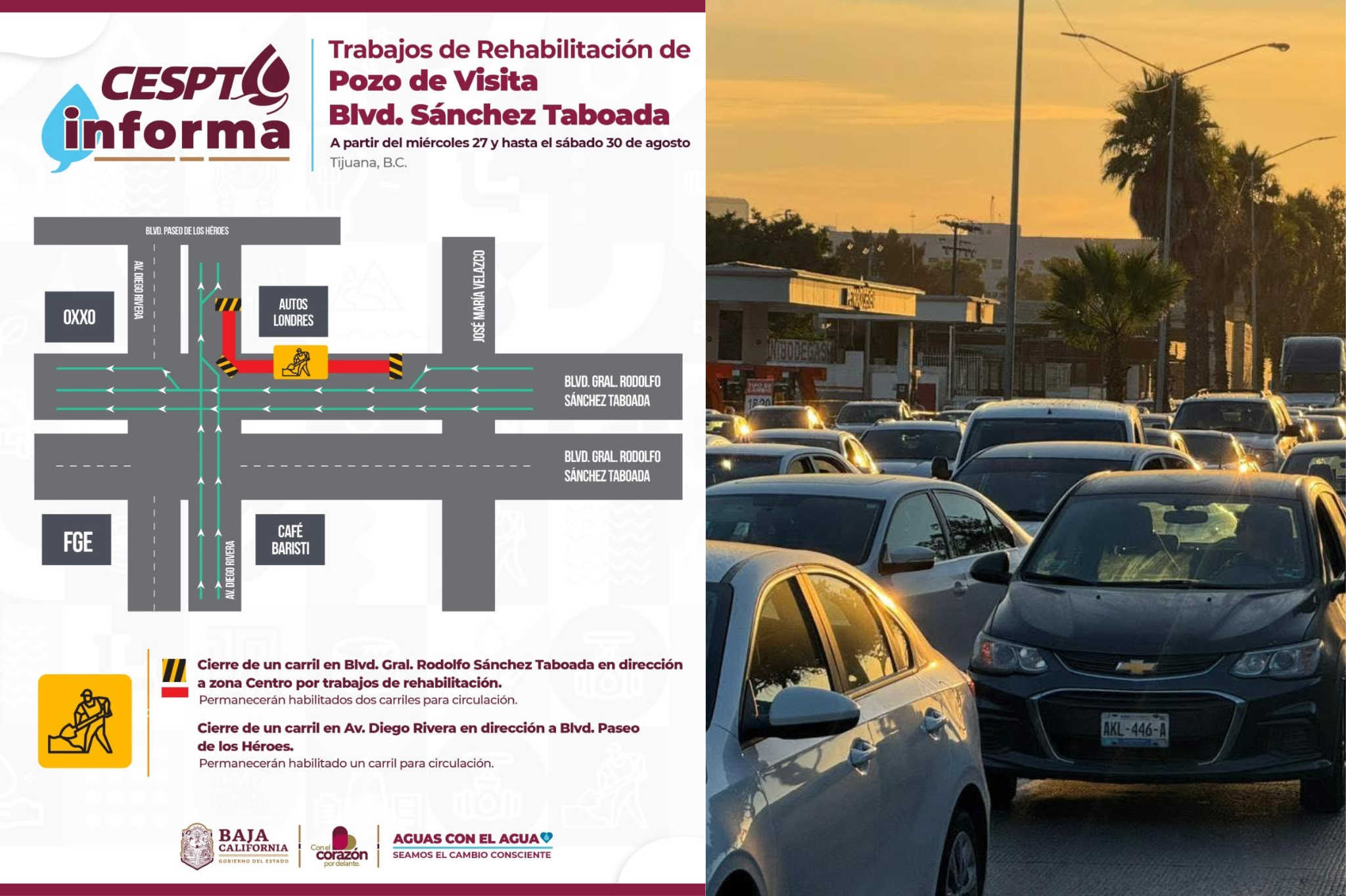La Comisión Estatal de Servicios Públicos de Tijuana (CESPT) informó que mañana, miércoles 27 de agosto, iniciarán los trabajos de rehabilitación de un pozo de visita ubicado sobre el bulevar Sánchez Taboada, en la Zona Río.