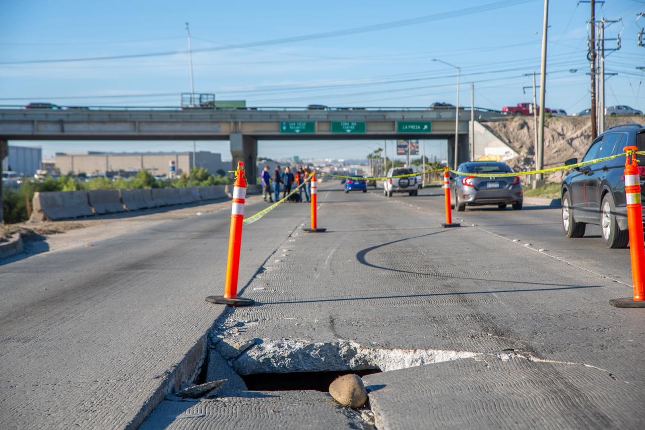 Este martes ya se habilita un desvío adicional por la terracería del nodo Simón Bolívar para abrir un carril más, con la finalidad de reducir las afectaciones viales, ya que el pluvial dañado corre por el carril central paralelo a la vialidad y desemboca en el río Tijuana.