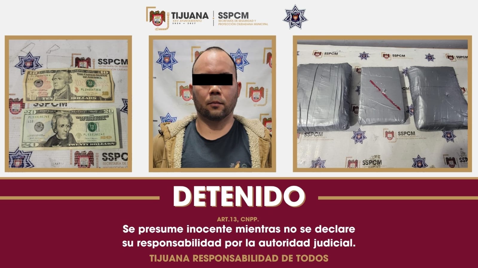 La Secretaría de Seguridad y Protección Ciudadana Municipal (SSPCM), informa que agentes de la Policía Municipal de Tijuana detuvieron a un hombre por su presunta responsabilidad en los delitos de cohecho y delitos contra la salud, durante un operativo de vigilancia en la colonia Zona Centro.