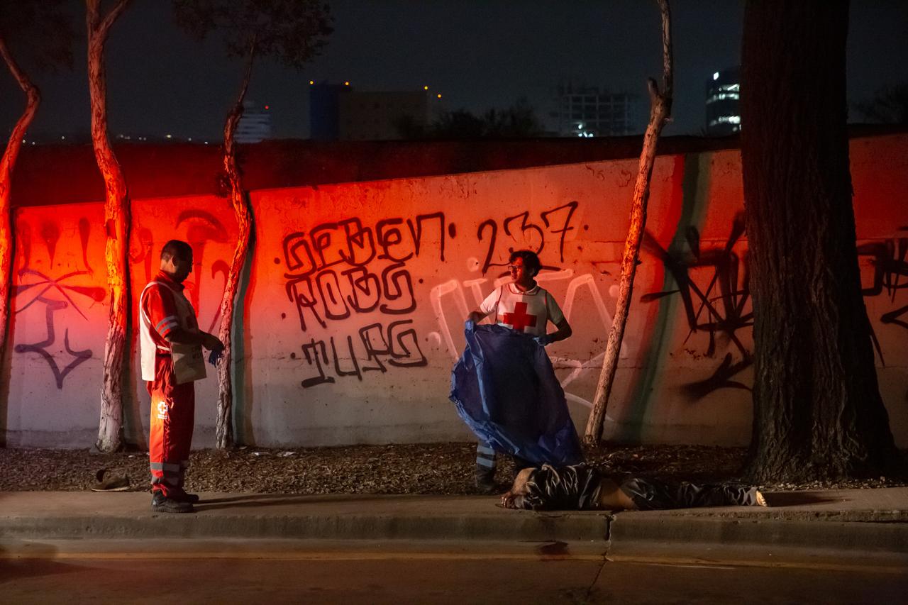 Paramédicos y elementos de rescate acudieron al lugar y confirmaron el fallecimiento del hombre y de su mascota. El cuerpo fue cubierto con una sábana azul mientras se esperaba el arribo de las autoridades ministeriales.
