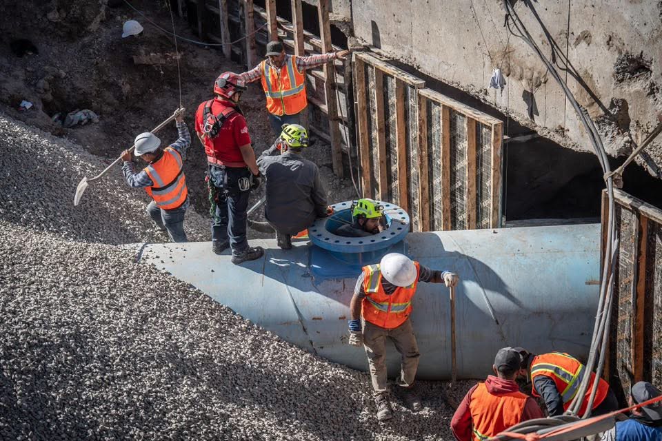 Actualmente, personal técnico realiza la inspección final en la instalación de la nueva tubería para asegurar su correcto funcionamiento.